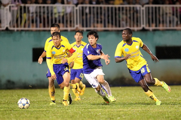 Công Phượng đi bóng trong vòng vây các cầu thủ S.Khánh Hòa |