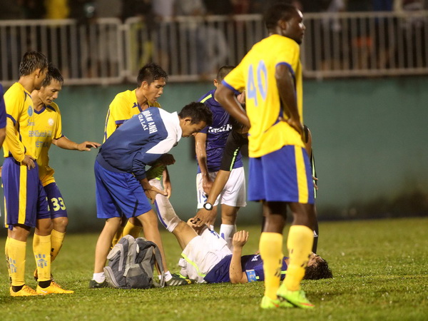 Anh thường xuyên bị các cầu thủ S.Khánh Hòa tìm cách phạm lỗi để ngăn cản |