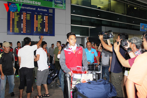 Chiều nay (8/12), đội tuyển bóng đá Việt Nam về nước tại sân bay Tân Sơn Nhất trước khi bay ra Hà Nội chuẩn bị cho trận lượt về bán kết AFF Suzuki Cup 2014. Đông đảo cổ động viên đã ra sân bay để đón các cầu thủ.