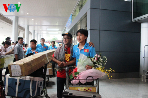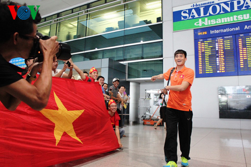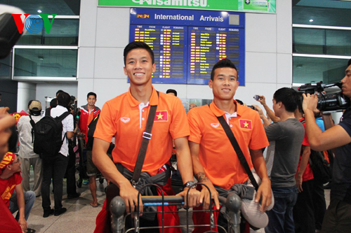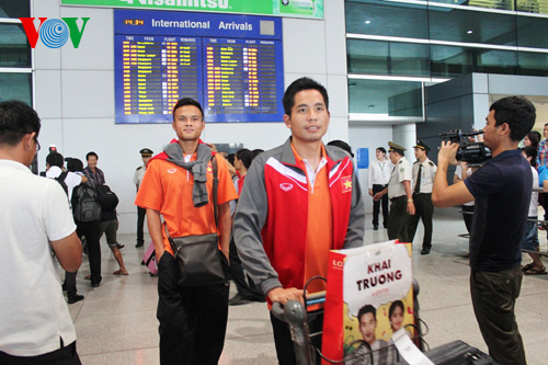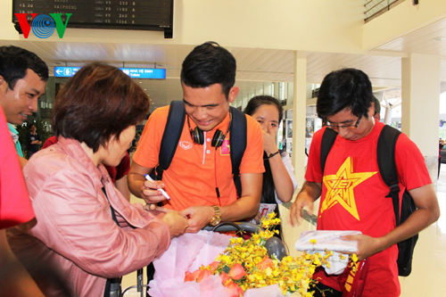 Do chuyến bay bị hoãn nên mãi đến hơn 14h các cầu thủ mới đến nơi. Dù mệt mỏi vì chuyến bay chậm và phải sang ngay khu vực ga trong nước để làm thủ tục bay ra Hà Nội, nhưng các tuyển thủ đều tươi cười và xúc động trước sự tiếp đón nồng nhiệt của các cổ động viên.