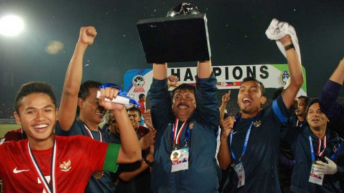 HLV Indra của U19 Indonesia giơ cúp vô địch U19 ĐNÁ 2013 sau khi đánh bại U19 VN. |
