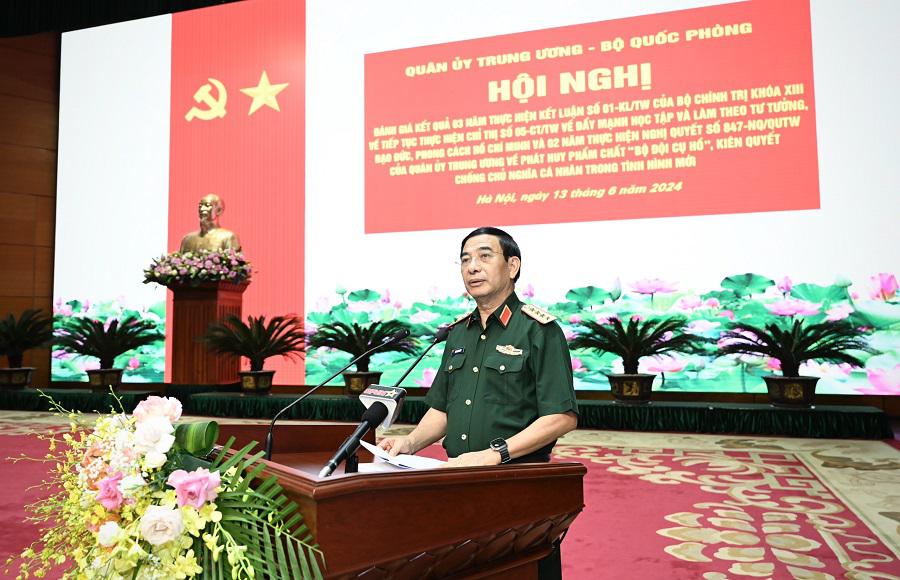 Sáng 13-6, tại Hà Nội, Quân ủy Trung ương, Bộ Quốc phòng tổ chức Hội nghị đánh giá kết quả 3 năm thực hiện Kết luận số 01-KL/TW của Bộ Chính trị khóa XIII về tiếp tục thực hiện Chỉ thị số 05-CT/TW về đẩy mạnh học tập và làm theo tư tưởng, đạo đức, phong cách Hồ Chí Minh và 2 năm thực hiện Nghị quyết số 847-NQ/QUTW của Quân ủy Trung ương về phát huy phẩm chất Bộ đội Cụ Hồ, kiên quyết chống chủ nghĩa cá nhân trong tình hình mới.