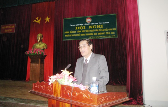 Tại Hội nghị, Phó Chủ tịch Ủy ban Mặt trận Tổ quốc tỉnh Bùi Nhân Sâm trình bày nội dung, thủ tục, trình tự giới thiệu người ứng cử, làm hồ sơ ứng cử theo quy định của Luật bầu cử đại biểu Quốc hội và đại biểu Hội đồng nhân dân 2015 và Nghị quyết liên tịch số 11/2016/NQLT/UBTVQH-CP-ĐCTUBTWMTTQVN ngày 01/02/2016 của Ủy ban Thường vụ Quốc hội, Chính phủ, Đoàn Chủ tịch Ủy ban Trung ương Mặt trận Tổ quốc Việt Nam về hướng dẫn quy trình hiệp thương, giới thiệu người ứng cử đại biểu Quốc hội khóa XIV, đại biểu Hội đồng nhân dân các cấp nhiệm kỳ 2016 - 2021.
