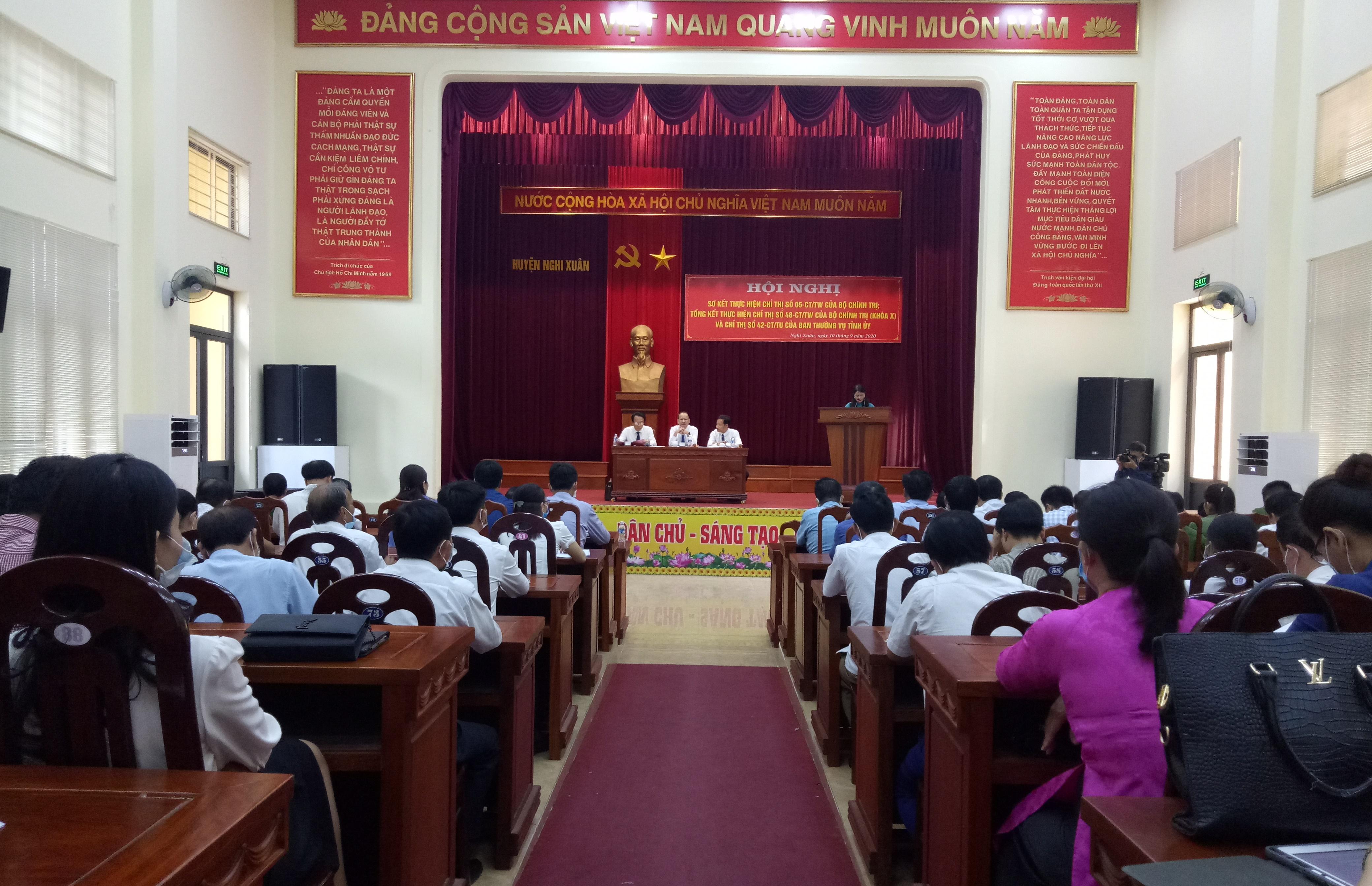 Sáng ngày 10/9/2020 Huyện ủy Nghi Xuân tổ chức Hội nghị sơ kết 04 năm thực hiện Chỉ thị số 05-CT/TW, ngày 15/5/2016 của Bộ Chính trị về đẩy mạnh học tập và làm theo tư tưởng, đạo đức, phong cách Hồ Chí Minh; tổng kết 10 năm thực hiện Chỉ thị số 48-CT/TW ngày 22/10/2010 của Bộ Chính trị về tăng cường sự lãnh đạo của Đảng đối với công tác phòng, chống tội phạm trong tình hình mới; tổng kết thực hiện Chỉ thị số 42-CT/TU, ngày 28/02/2020 của Ban Thường vụ Tỉnh ủy về tổ chức phong trào thi đua chào mừng đại hội Đảng các cấp, Đại hội đại biểu Đảng bộ tỉnh lần thứ XIX, tiến tới Đại hội lần thứ XIII của Đảng.