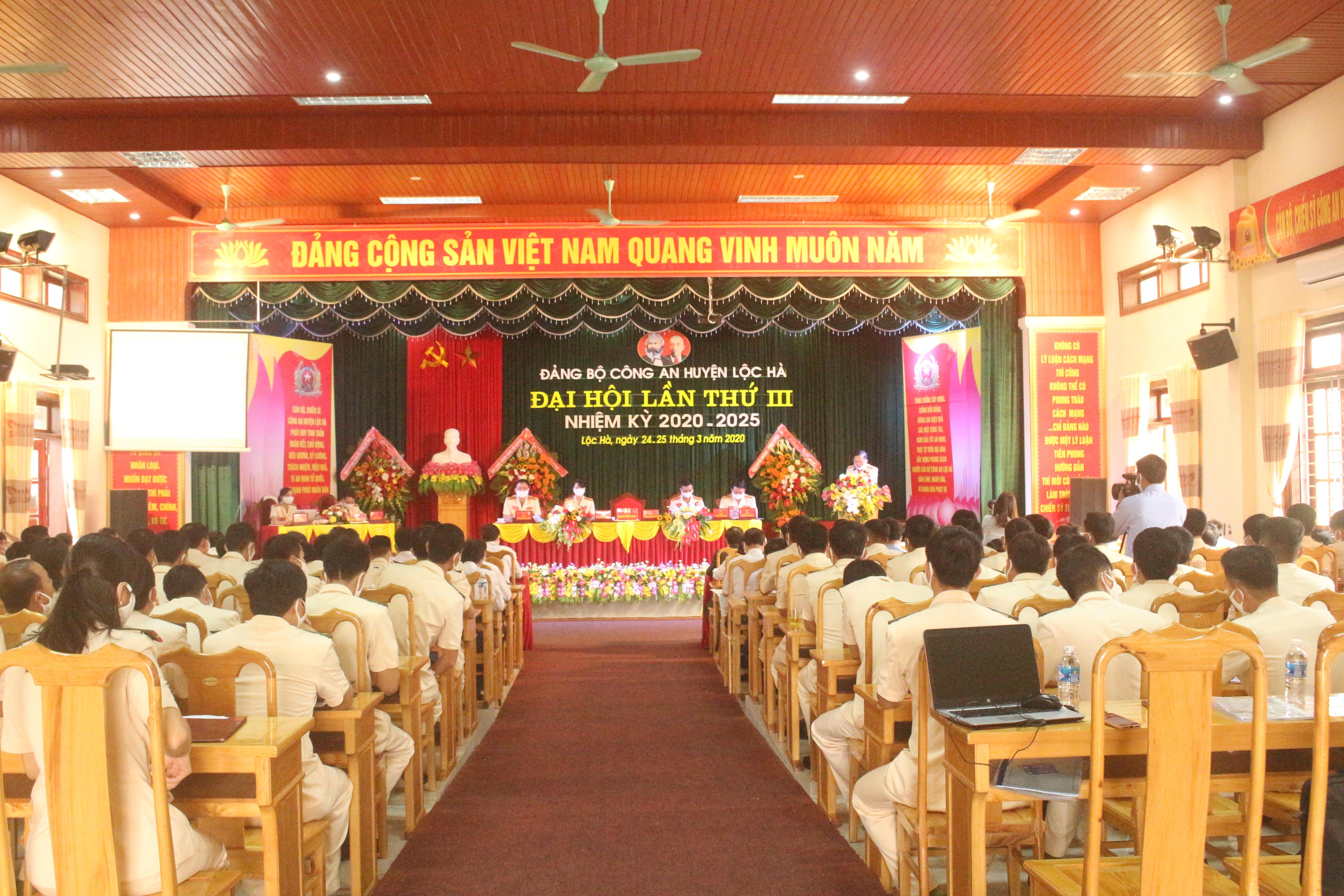 Sáng ngày 25/3/2020, Đảng bộ Công an huyện Lộc Hà tổ chức phiên chính thức Đại hội lần thứ III, nhiệm kỳ 2020 - 2025. Đây là đảng bộ đầu tiên được Ban Thường vụ Huyện ủy Lộc Hà chọn tổ chức đại hội điểm cấp cơ sở để rút kinh nghiệm cho 28 đảng bộ cơ sở còn lại. Dự và chỉ đạo Đại hội có đồng chí Hoàng Trung Dũng, Phó Bí thư thường trực Tỉnh ủy; đại diện Đoàn công tác chỉ đạo, kiểm tra, giám sát của Ban Thường vụ Tỉnh ủy tại huyện Lộc Hà; đại diện Đảng ủy Công an tỉnh; đồng chí Nguyễn Thế Hoàn, Tỉnh ủy viên, Bí thư Huyện ủy Lộc Hà.