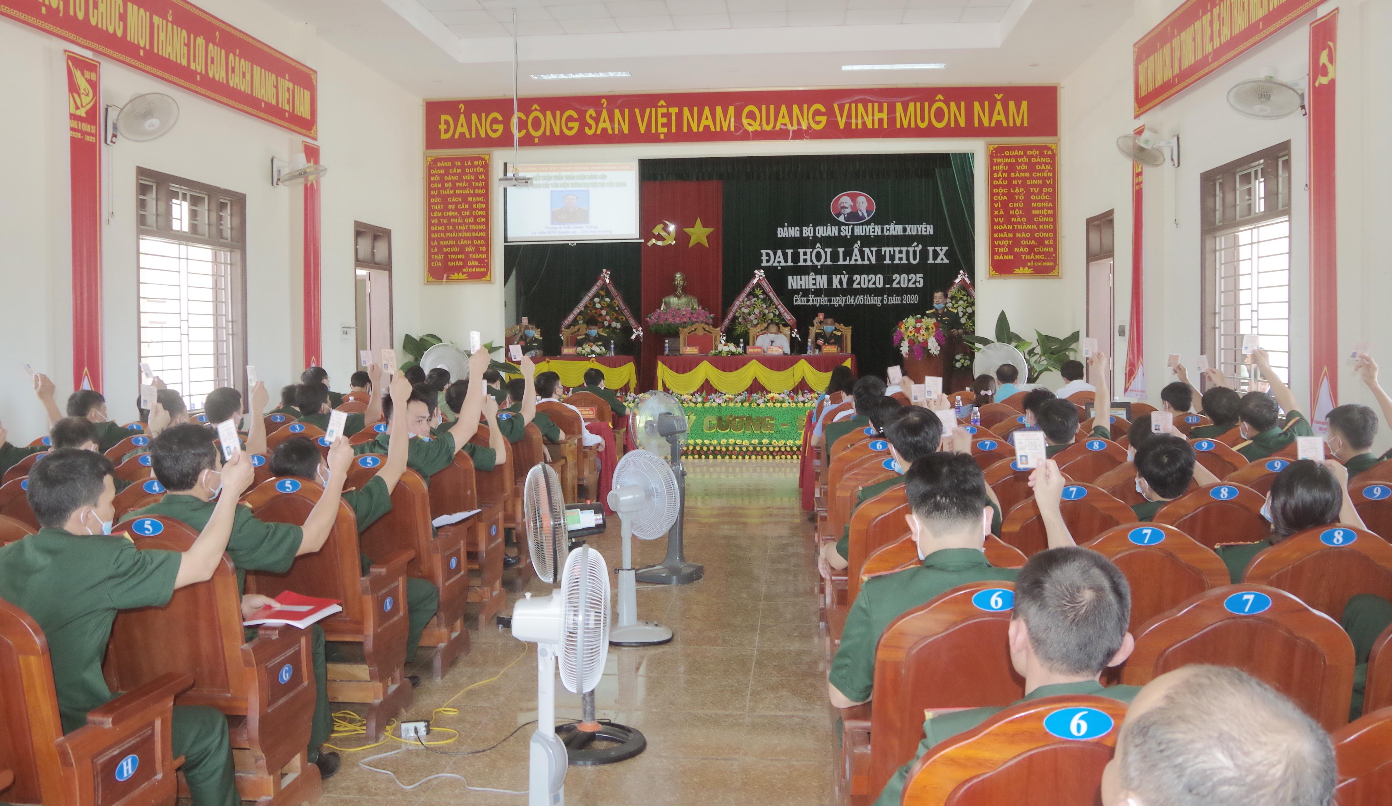 Thực hiện Kế hoạch số 707-KH/ĐUQS, ngày 25/10/2019 của Đảng ủy Quân sự tỉnh về việc phối hợp chỉ đạo Đảng ủy Quân sự huyện Cẩm Xuyên tổ chức đại hội trước để rút kinh nghiệm; sau quá trình chuẩn bị chu đáo, theo đúng hướng dẫn, trong hai ngày 04 và 05/5/2020, Đại hội Đảng bộ Quân sự huyện Cẩm Xuyên lần thứ IX, nhiệm kỳ 2020 - 2025 đã tiến hành phiên trù bị và phiên chính thức.