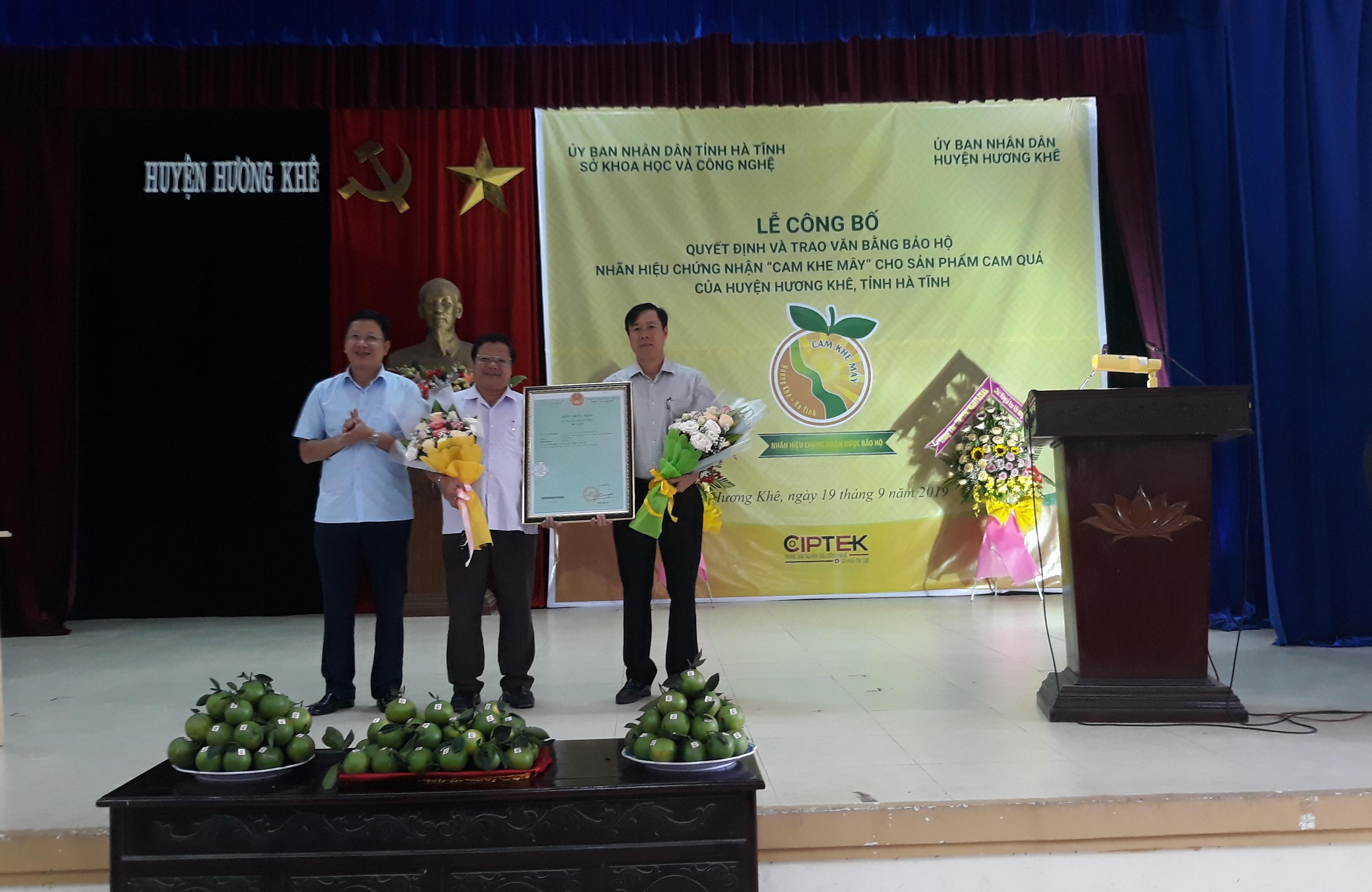 Ngày 19/9/2019, Sở Khoa học và Công nghệ phối hợp với Ủy ban nhân dân huyện Hương Khê, Trung tâm nghiên cứu Công nghệ và Sở hữu trí tuệ CIPTEK tổ chức Lễ công bố và trao văn bằng bảo hộ chứng nhận “Cam Khe Mây” cho sản phẩm cam của Huyện Hương Khê.