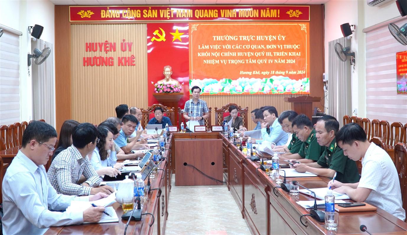 Sáng ngày 16/9/2024, Thường trực Huyện ủy Hương Khê tổ chức làm việc với Ủy ban Mặt trận Tổ quốc và các tổ chức chính trị - xã hội huyện về kết quả thực hiện nhiệm vụ 9 tháng đầu năm, nhiệm vụ trọng tâm 3 tháng cuối năm 2024.