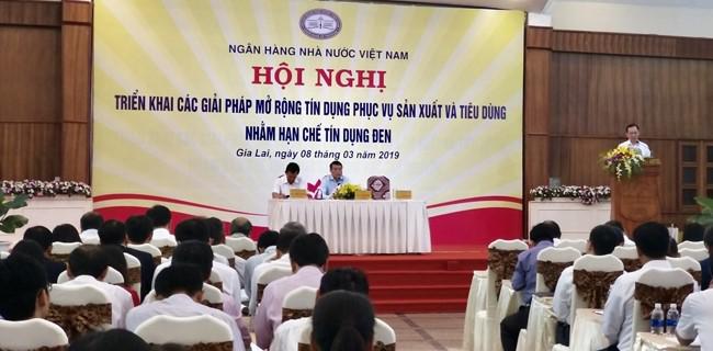 Sáng 8-3, tại TP Plây-Cu (Gia Lai), Ngân hàng Nhà nước Việt Nam (NHNN) phối hợp UBND tỉnh Gia Lai tổ chức Hội nghị triển khai các giải pháp mở rộng tín dụng phục vụ sản xuất và tiêu dùng nhằm hạn chế tín dụng đen.