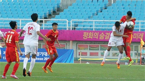 Phút 22, Olympic Việt Nam đáp trả bằng pha đánh đầu khá hiểm hóc về góc xa đưa bóng đi chệch khung thành đối phương trong gang tấc của Mạc Hồng Quân.