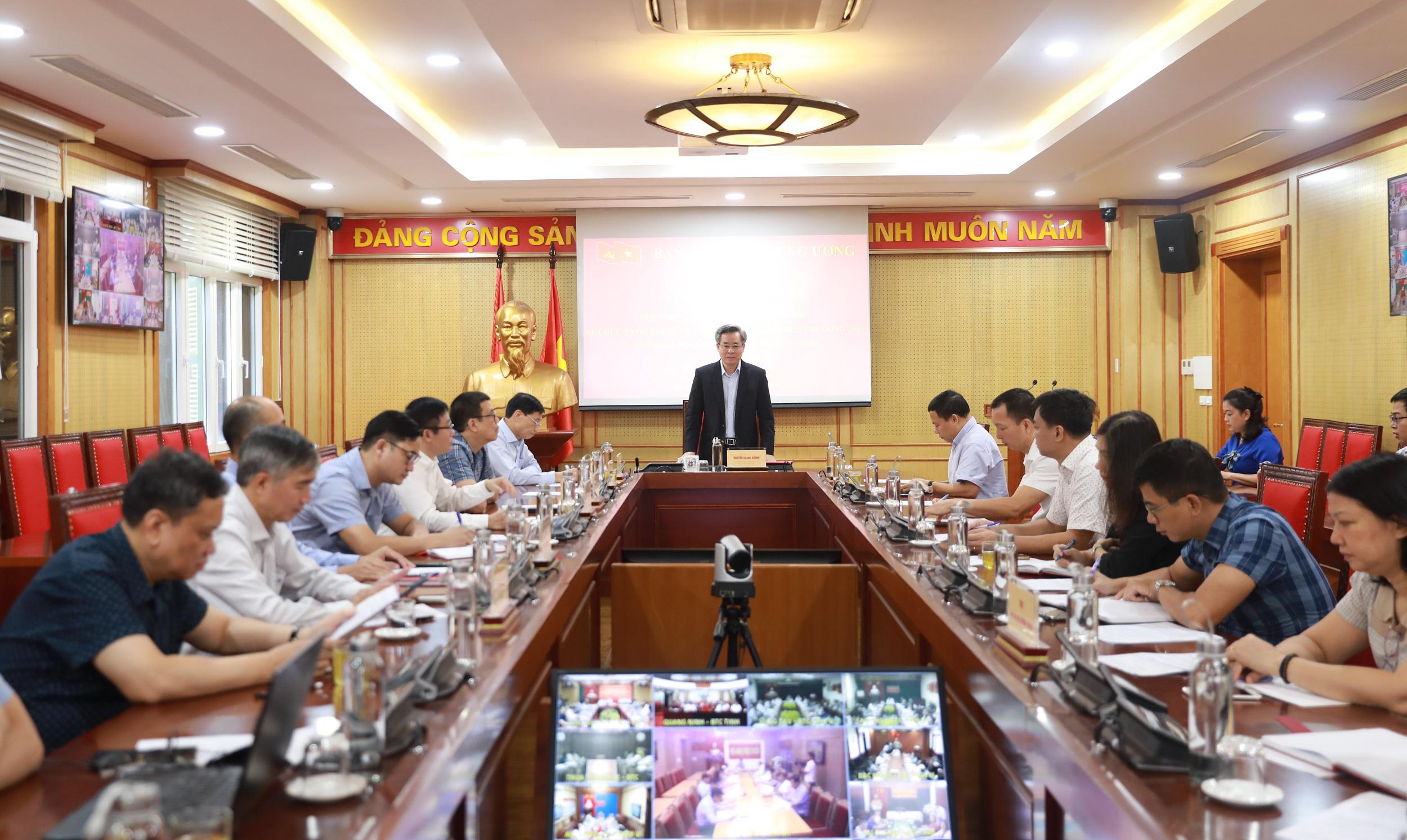 Ngày 27-10, Ban Tổ chức Trung ương tổ chức Hội nghị trực tuyến góp ý dự thảo Quy định của Ban Bí thư về chức năng, nhiệm vụ, cơ cấu tổ chức, mối quan hệ công tác của đảng đoàn, ban cán sự đảng cấp tỉnh. Đồng chí Nguyễn Quang Dương, Ủy viên Trung ương Đảng, Phó Trưởng Ban Tổ chức Trung ương chủ trì Hội nghị.