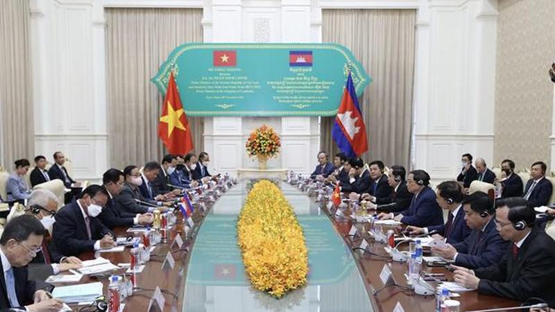 Quyết tâm củng cố và phát triển hơn nữa quan hệ láng giềng tốt đẹp, hữu nghị truyền thống, hợp tác toàn diện, bền vững lâu dài giữa Việt Nam và Campuchia, đưa hợp tác song phương ngày càng đi vào chiều sâu, thực chất và hiệu quả. Đây là khẳng định mạnh mẽ của Thủ tướng Phạm Minh Chính và Thủ tướng Vương quốc Campuchia Samdech Techo Hun Sen tại cuộc hội đàm sáng 8/11.