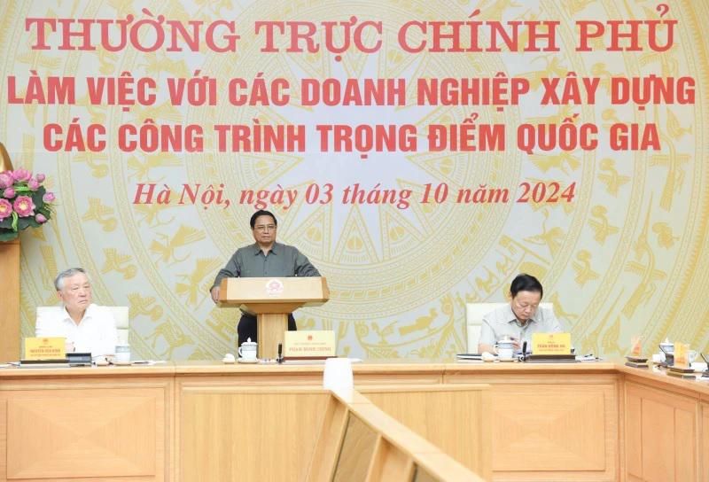 Chiều 3/10, tại Trụ sở Chính phủ, Thủ tướng Phạm Minh Chính chủ trì cuộc làm việc của Thường trực Chính phủ với các doanh nghiệp xây dựng các công trình trọng điểm quốc gia. Cùng dự có các Phó Thủ tướng Chính phủ Nguyễn Hòa Bình, Trần Hồng Hà và Hồ Đức Phớc; lãnh đạo các bộ, ngành Trung ương; các hiệp hội, nhà thầu xây dựng.