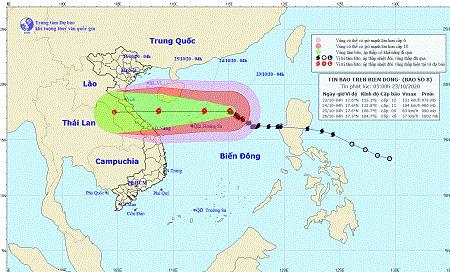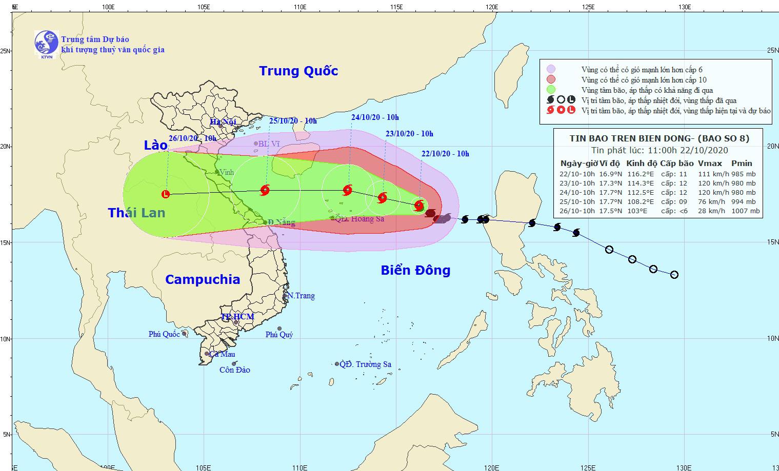 Hồi 4h ngày 23/10, sức gió mạnh nhất vùng gần tâm bão mạnh cấp 12 (115-135 km/giờ), giật cấp 15, nhưng bão số 8 được dự báo sẽ suy yếu trong những ngày tới.