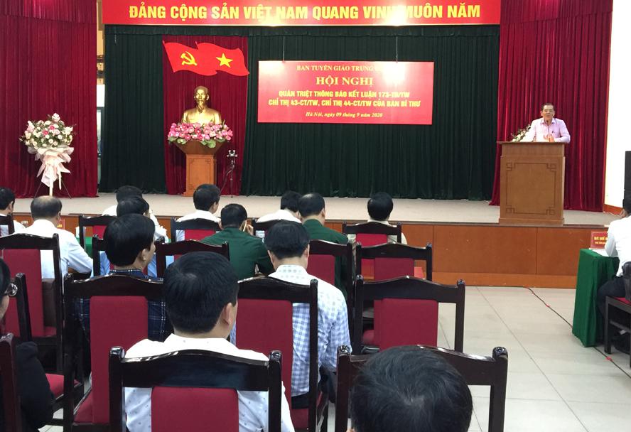 Sáng ngày 09/9/2020, tại Hà Nội, Ban Tuyên giáo Trung ương phối hợp với Bộ Thông tin và Truyền thông, Báo Nhân dân, Tạp chí Cộng sản, Nhà xuất bản Chính trị quốc gia Sự thật, Hội Nhà báo Việt Nam tổ chức Hội nghị trực tuyến quán triệt Kết luận số 173-KL/TW, ngày 06/4/2020 của Bộ Chính trị về “tiếp tục thực hiện Chỉ thị số 11-CT/TW về mua và đọc báo, tạp chí của Đảng”; Chỉ thị số 43-CT/TW, ngày 08/4/2020 của Ban Bí thư về “tăng cường sự lãnh đạo của Đảng đối với hoạt động của Hội Nhà báo Việt Nam trong tình hình mới” và Chỉ thị số 44-CT/TW, ngày 16/4/2020 của Ban Bí thư về “đổi mới, nâng cao chất lượng, hiệu quả công tác xuất bản, phát hành và nghiên cứu, học tập sách lý luận, chính trị”.