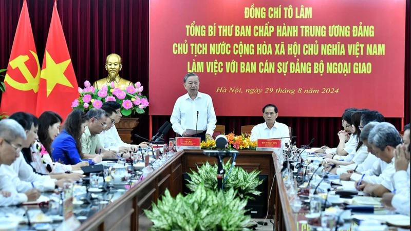 Ngày 29/8, tại Hà Nội, Tổng Bí thư, Chủ tịch nước Tô Lâm đã có buổi làm việc với Ban Cán sự đảng Bộ Ngoại giao về triển khai đường lối đối ngoại Đại hội lần thứ XIII của Đảng và phát triển ngành ngoại giao.