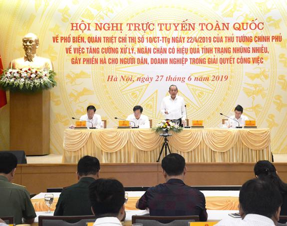 Ngày 27-6, Chính phủ đã tổ chức hội nghị trực tuyến toàn quốc về phổ biến, quán triệt Chỉ thị số 10/CT-TTg ngày 22-4-2019 của Thủ tướng Chính phủ về việc tăng cường xử lý, ngăn chặn có hiệu quả tình trạng nhũng nhiễu, gây phiền hà cho người dân, doanh nghiệp trong giải quyết công việc.