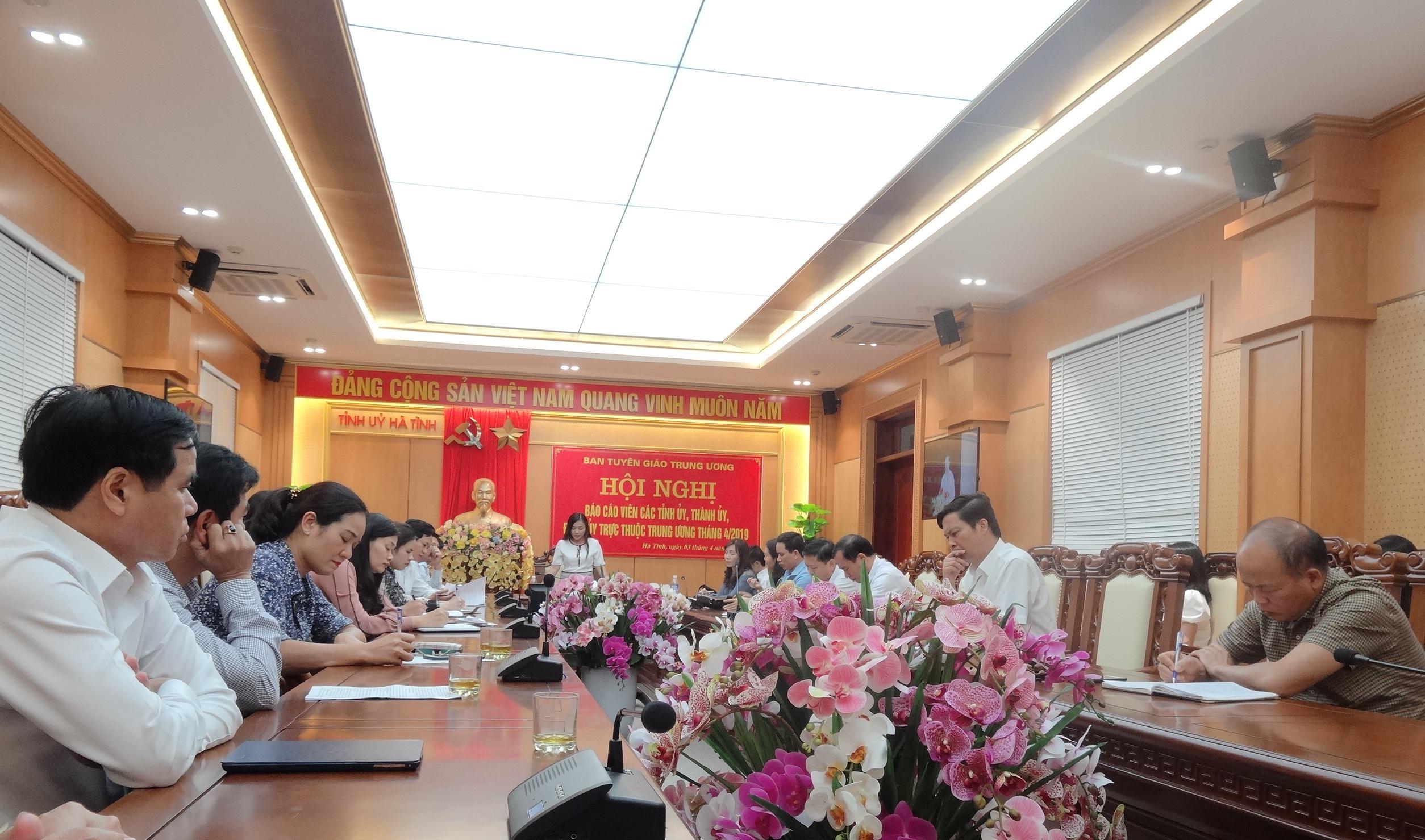 Sáng ngày 03/4/2019, Ban Tuyên giáo Trung ương tổ chức Hội nghị trực tuyến báo cáo viên các tỉnh ủy, thành ủy, đảng ủy trực thuộc Trung ương tháng 4/2019. Chủ trì điểm cầu Trung ương có đồng chí Lê Mạnh Hùng, Phó Trưởng Ban Tuyên giáo Trung ương; điểm cầu Hà Tĩnh có đồng chí Nguyễn Thị Hà Tân, Tỉnh ủy viên, Phó Trưởng ban Thường trực Ban Tuyên giáo Tỉnh ủy.