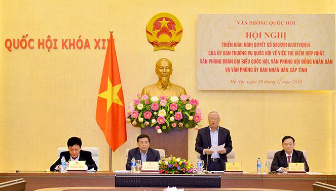 Sáng 29-11, tại Nhà QH, VPQH đã tổ chức Hội nghị triển khai Nghị quyết số 580/2018/UBTVQH14 ngày 4-10-2018 của UBTVQH về việc thí điểm hợp nhất Văn phòng Đoàn ĐBQH, Văn phòng HĐND và Văn phòng UBND cấp tỉnh. Ủy viên Trung ương Đảng, Phó Chủ tịch QH Uông Chu Lưu; Ủy viên Trung ương Đảng, Trưởng ban Công tác đại biểu Trần Văn Túy tới dự. Ủy viên Trung ương Đảng, Tổng Thư ký QH, Chủ nhiệm VPQH Nguyễn Hạnh Phúc chủ trì Hội nghị.