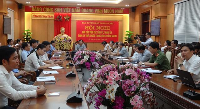Sáng ngày 14/9/2018, Ban Tuyên giáo Trung ương tổ chức Hội nghị báo cáo viên các tỉnh ủy, thành ủy, đảng ủy trực thuộc Trung ương tháng 9/2018 bằng hình thức trực tuyến. Tham dự hội nghị điểm tại cầu Trung ương có đồng chí Lê Đình Hùng, Phó Trưởng Ban Tuyên giáo Trung ương, đại diện lãnh đạo một số ban, bộ, ngành; điểm cầu Hà Tĩnh có đồng chí Hoàng Trung Dũng, Ủy viên Ban Thường vụ, Trưởng Ban Tuyên giáo Tỉnh ủy và các đồng chí lãnh đạo Ban, các đồng chí báo cáo viên Tỉnh ủy.