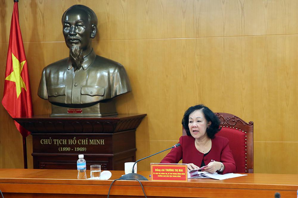 Sáng 4/7, tại Hà Nội, đồng chí Trương Thị Mai, Ủy viên Bộ Chính trị, Bí thư Trung ương Đảng, Trưởng ban Dân vận Trung ương, Trưởng ban Chỉ đạo Trung ương thực hiện quy chế dân chủ ở cơ sở đã chủ trì cuộc họp của Ban Chỉ đạo để thảo luận về kết quả 3 năm thực hiện Kết luận số 120-KL/TW ngày 7/1/2016 của Bộ Chính trị khóa XI "Về tiếp tục đẩy mạnh, nâng cao chất lượng, hiệu quả việc xây dựng và thực hiện quy chế dân chủ ở cơ sở".