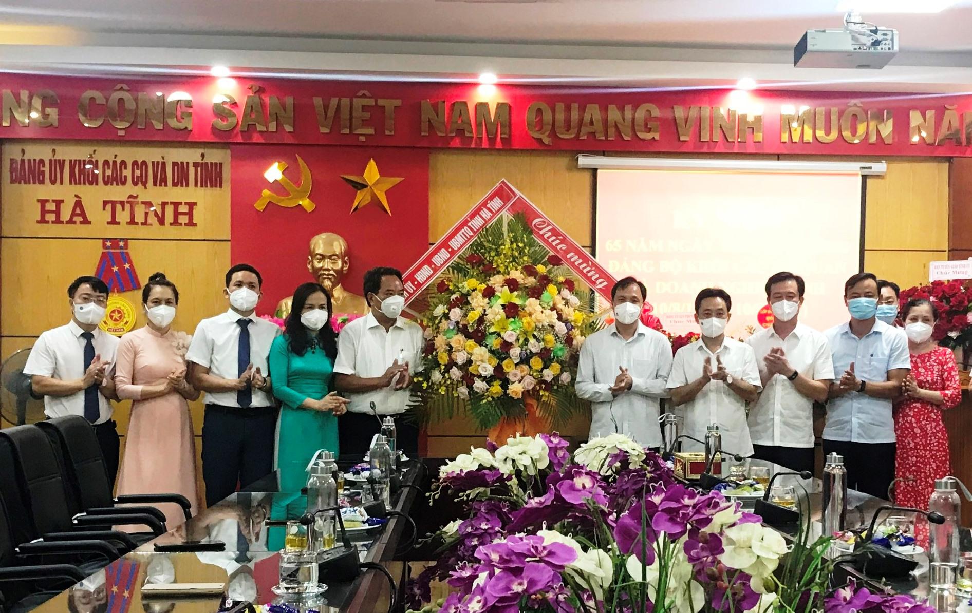 Nhân dịp kỷ niệm 65 năm Ngày truyền thống Đảng bộ Khối các cơ quan và doanh nghiệp tỉnh Hà Tĩnh (10/8/1956 - 10/8/2021), sáng ngày 09/8/2021, đại diện Thường trực Tỉnh ủy, Hội đồng nhân dân, Ủy ban nhân dân, Ủy ban Mặt trận Tổ quốc tỉnh, các ban xây dựng Đảng Tỉnh ủy và một số sở, ngành, cơ quan, đơn vị, doanh nghiệp tỉnh đã đến chúc mừng cán bộ, công chức Đảng bộ Khối các cơ quan và doanh nghiệp tỉnh.