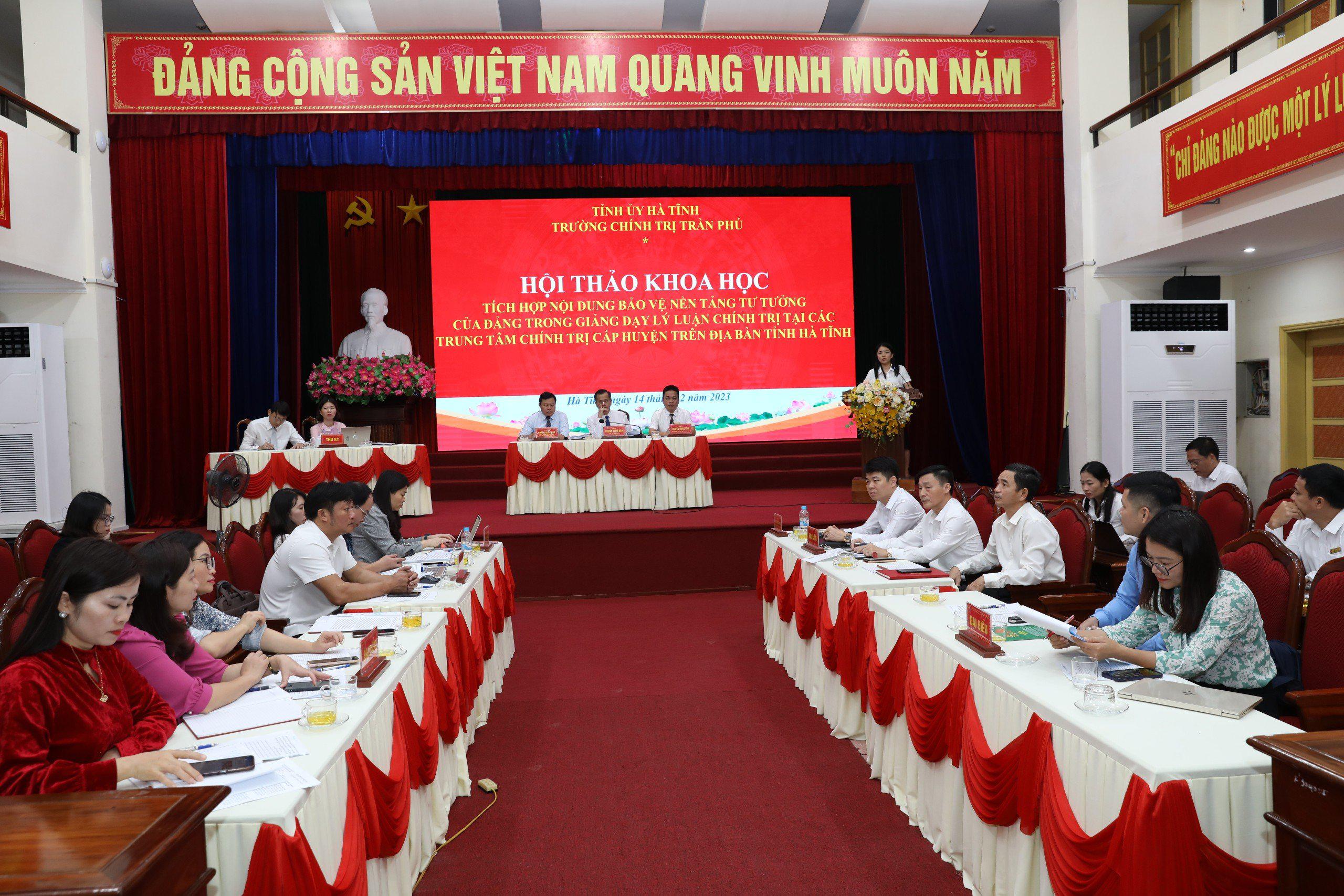 Triển khai thực hiện nhiệm vụ Đề tài cấp tỉnh “Nâng cao chất lượng công tác giáo dục lý luận chính trị với nhiệm vụ bảo về nền tảng tư tưởng của Đảng trong giai đoạn hiện nay tại Hà Tĩnh” và Kế hoạch nghiên cứu khoa học năm 2023, sáng ngày 14/12/2023, Trường Chính trị Trần Phú tổ chức Hội thảo khoa học “Tích hợp nội dung bảo vệ nền tảng tư tưởng của Đảng trong giảng dạy lý luận chính trị tại trung tâm chính trị cấp huyện trên địa bàn tỉnh Hà Tĩnh”.