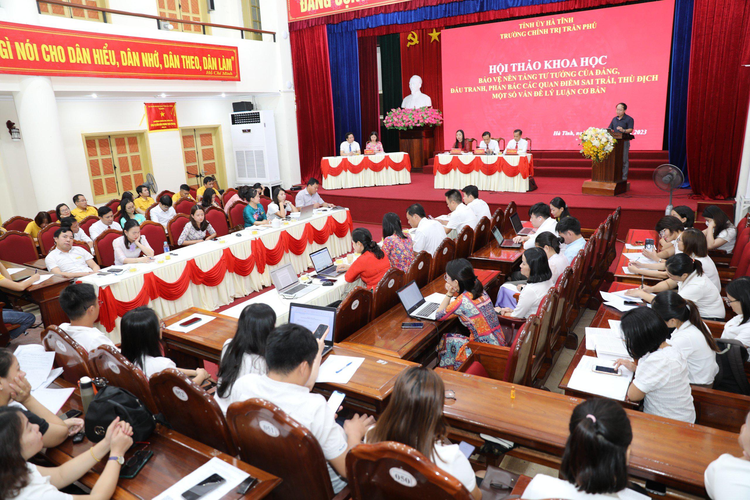 Triển khai thực hiện nhiệm vụ Đề tài cấp tỉnh “Nâng cao chất lượng công tác giáo dục lý luận chính trị với nhiệm vụ bảo về nền tảng tư tưởng của Đảng trong giai đoạn hiện nay tại Hà Tĩnh” và Kế hoạch nghiên cứu khoa học năm 2023, sáng ngày 05/10/2023, Trường Chính trị Trần Phú tổ chức Hội thảo khoa học “Bảo vệ nền tảng tư tưởng của Đảng, đấu tranh phản bác các quan điểm sai trái, thù địch - Một số vấn đề lý luận cơ bản”.