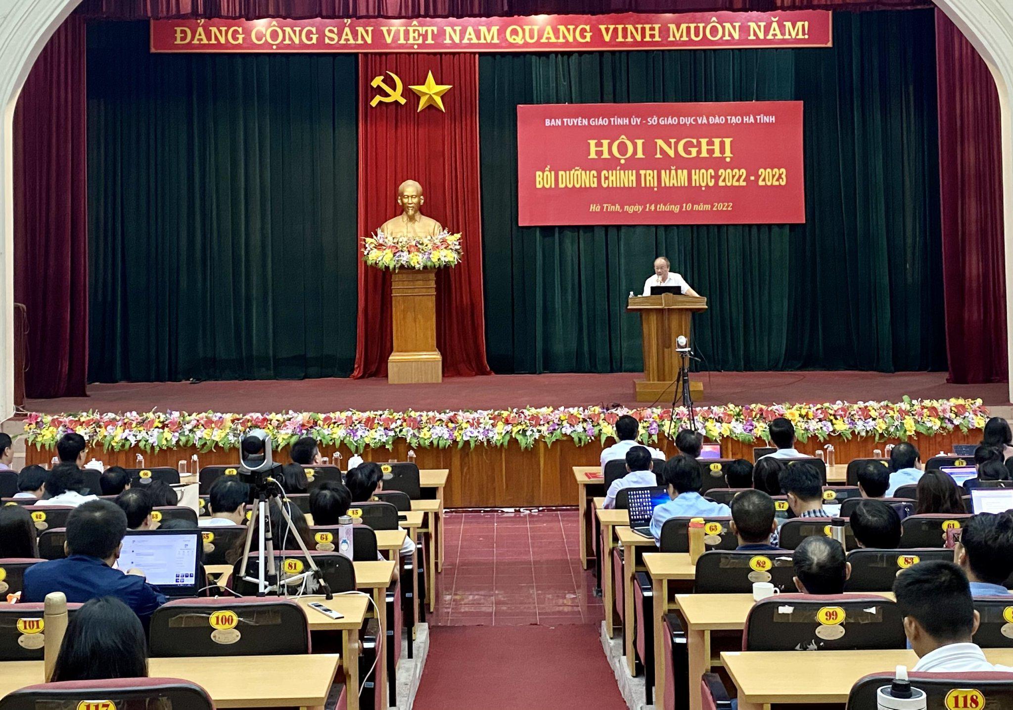 Sáng ngày 14/10/2022, Ban Tuyên giáo Tỉnh ủy phối hợp với Sở Giáo dục và Đào tạo tổ chức Hội nghị Bồi dưỡng chính trị, năm học 2022 - 2023 cho đội ngũ cán bộ quản lý, giáo viên ngành giáo dục và đào tạo trên địa bàn tỉnh. Hội nghị được tổ chức bằng hình thức trực tiếp kết hợp trực tuyến tới 77 điểm cầu ở 13 huyện, thị xã, thành phố và các trường trung học phổ thông trên địa bàn tỉnh.
