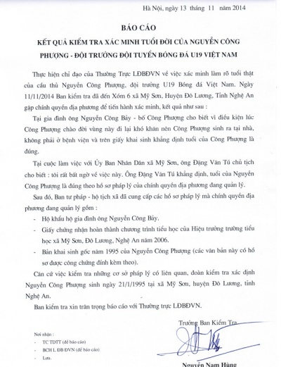 Căn cứ việc kiểm tra những cơ sở pháp lý có liên quan, Ban kiểm tra VFF xác định cầu thủ Nguyễn Công Phượng sinh ngày 21/1/1995 tại xã Mỹ Sơn, huyện Đô Lương, tỉnh Nghệ An.